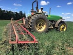 A farm worker runs a tine weeder on Jason Hunton's organic wheat crop. It’s like a giant comb, scraping up the weeds and some bits of wheat along with it.
