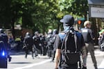 Portland police officers patrol a barricade between opposing groups at a rally in downtown Portland Sunday, Sept. 10, 2017.