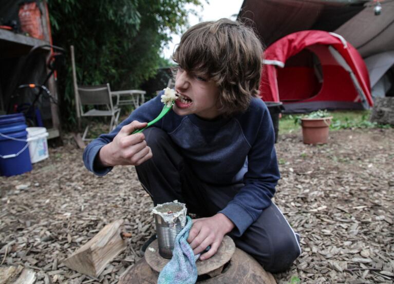 The Stephens cook lunch on the fire in the backyard of their house in north Portland. Over the weekend, The Stephens had to live off what they could find and cook, without using power sources or running water. They chose to live in their backyard and sleep in tents.